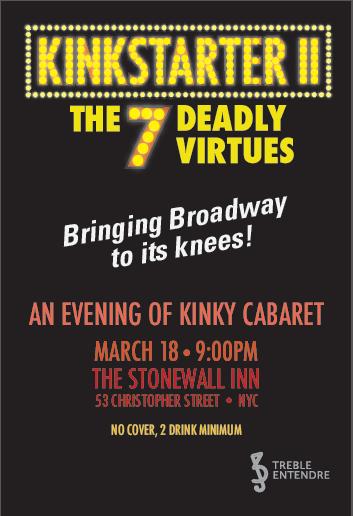 Please join us for an evening of cabaret as Dogboy & Justine alumni and friends once again bring Broadway to its knees by putting a naughty, kinky twist on musical theater classics with Kinkstarter II: The 7 Deadly Virtues.